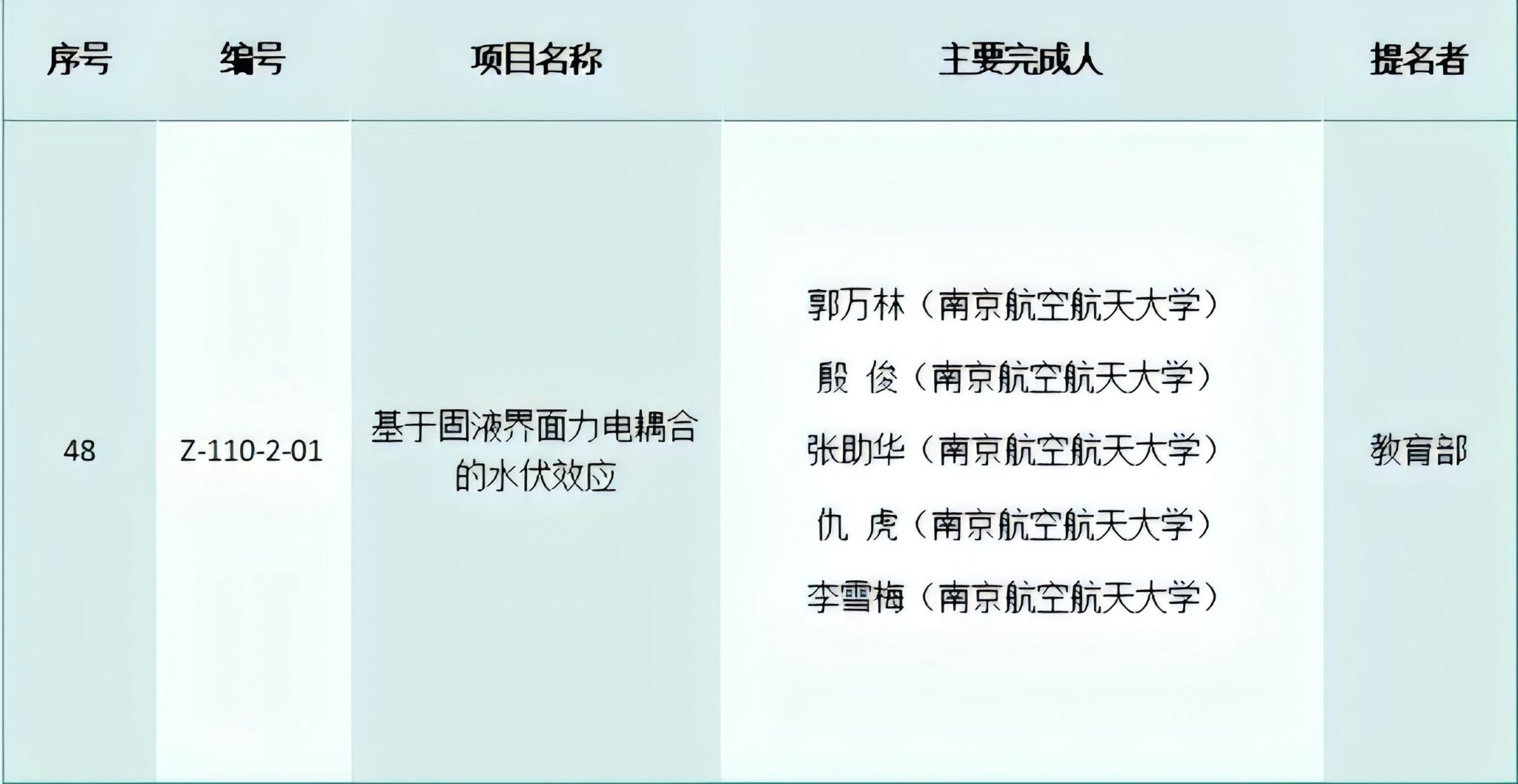 南京航空航天大学航空学院郭万林院士团队完成的“基于固液界面力电耦合的水伏效应”荣获国家自然科学二等奖。